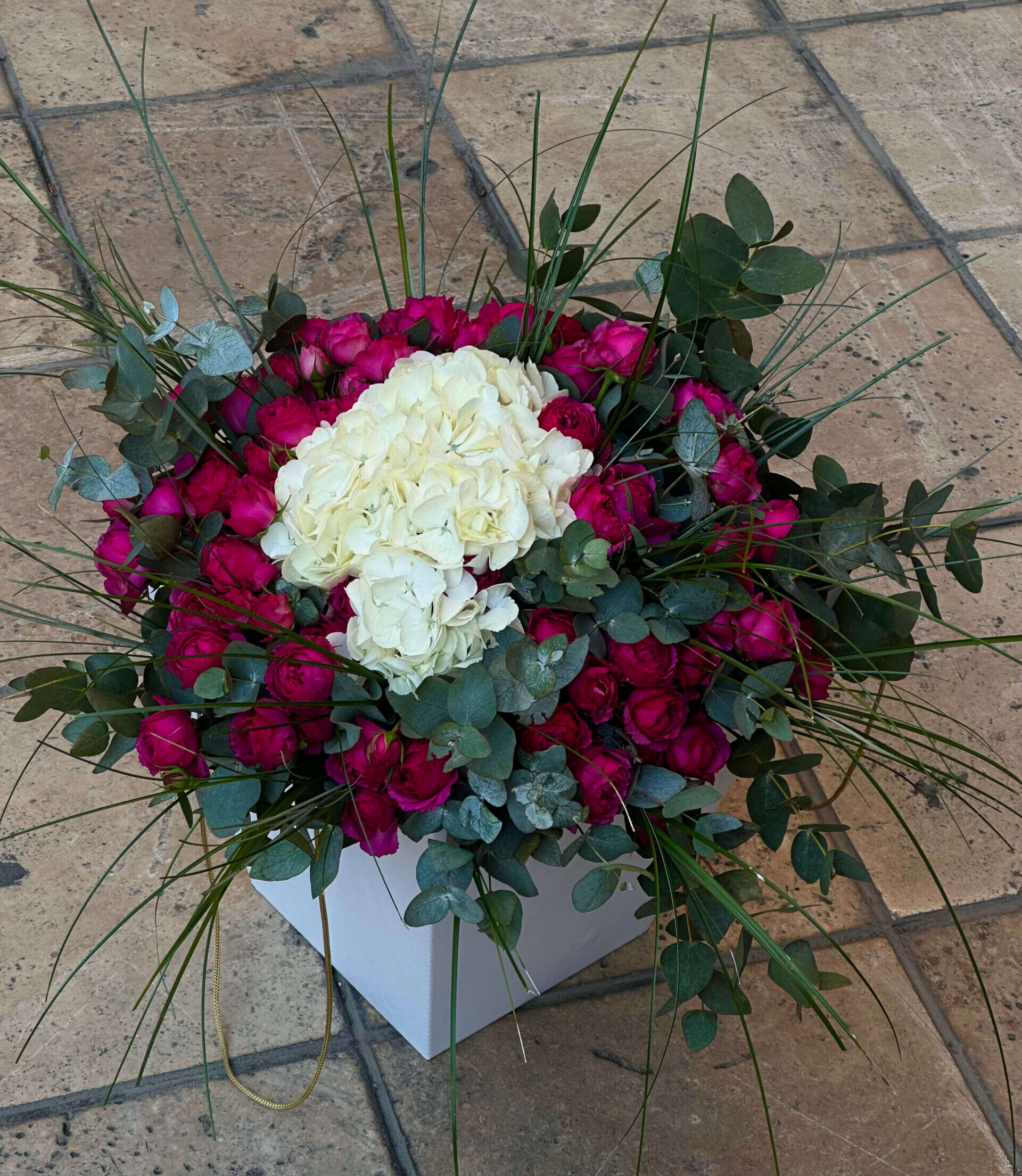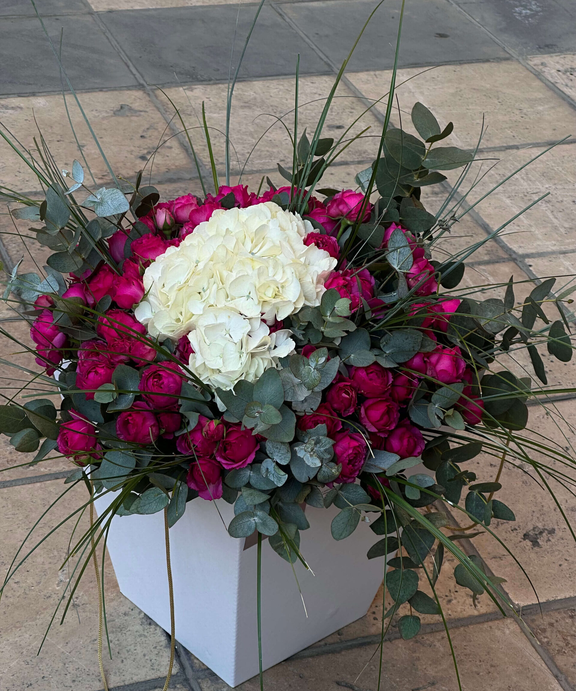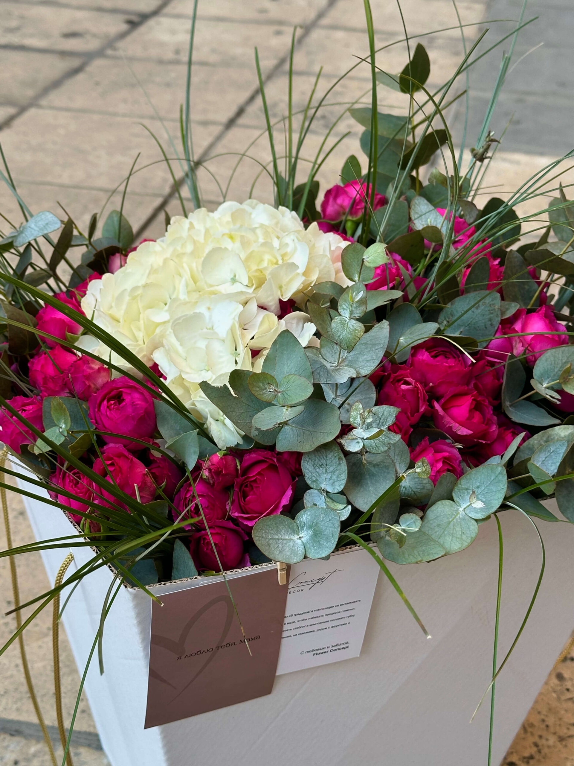 Ծաղկեփնջի կազմը՝ Հորթենզիա, փնջային վարդեր, էվկալիպտ, բերգրաս