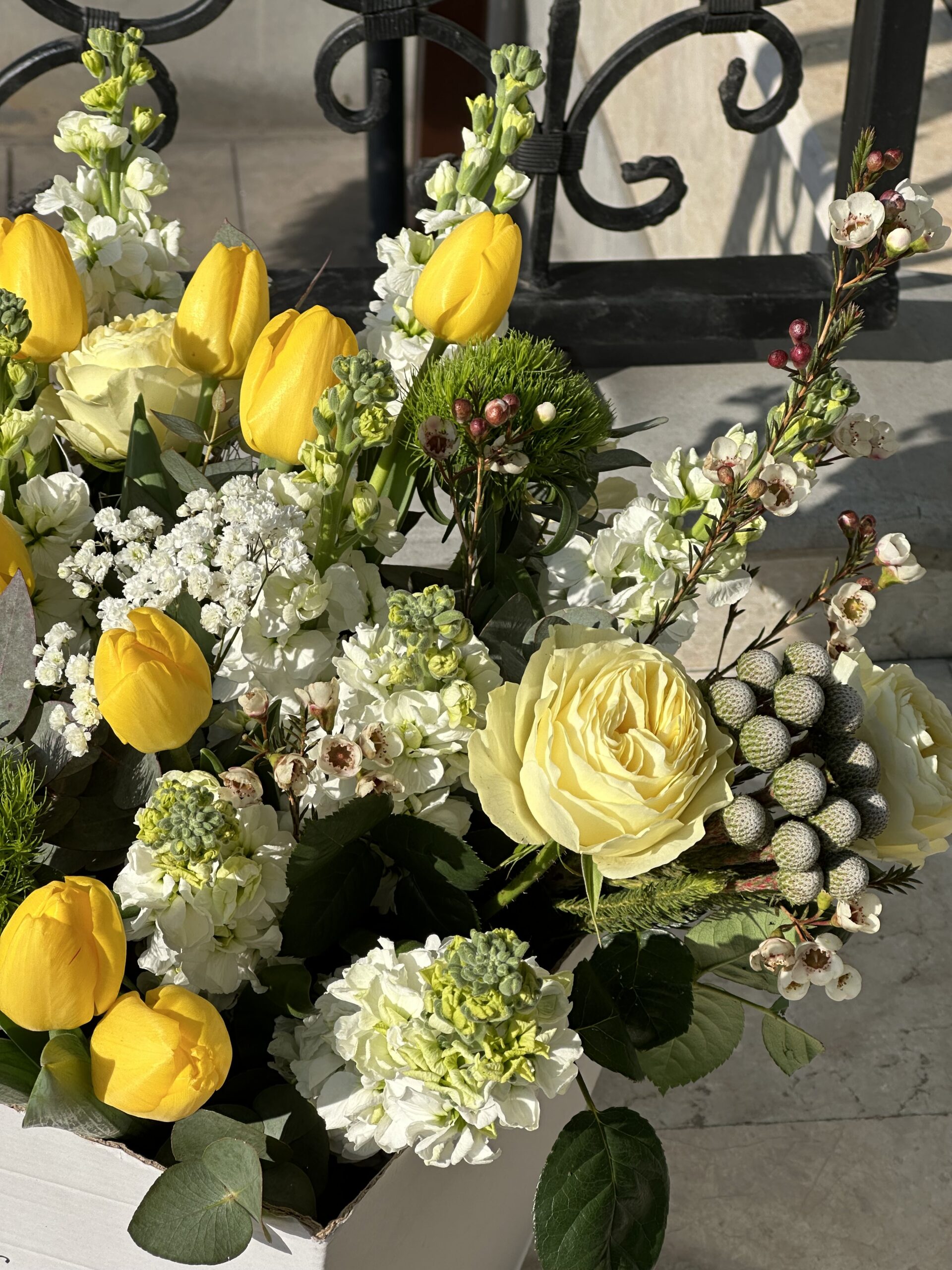 Состав букета: тюльпаны, матиолла, пионовидные розы, гвоздика, эвкалипт